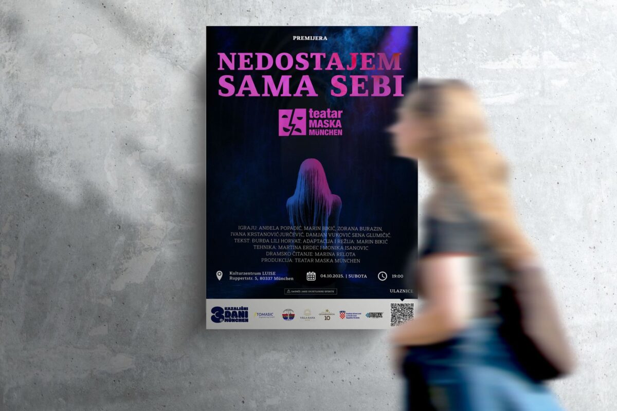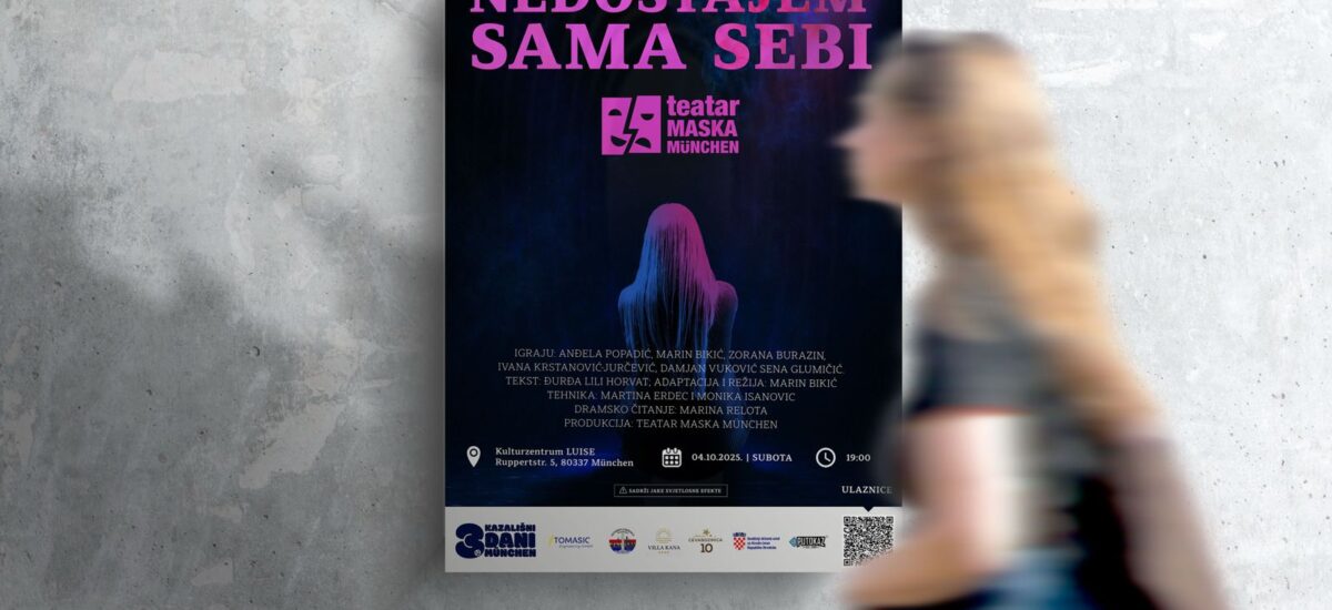 Nakon uvodnog dijela, Teatar MASKA München premijerno će izvesti predstavu „Nedostajem sama sebi“ – snažan dramsko-koreografski prikaz borbe s ovisnošću.